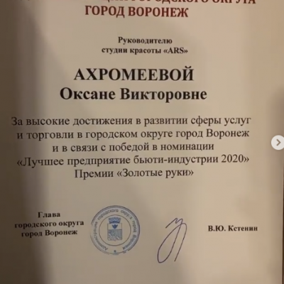 Наш салон красоты ARS был отмечен администрацией городского округа и победил в номинации "Лучшее предприятие бьюти-индустрии 2020" Премии "Золотые руки".